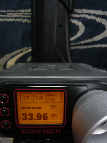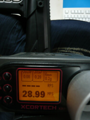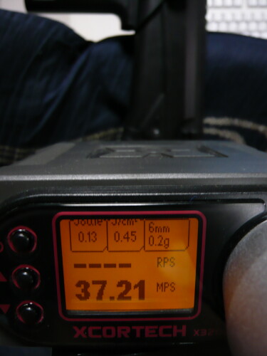 バスッという音を立てて弾は勢い良く飛んで行きます。初速を測ると30mps前後だったものが36前後まで向上。ただガスタンクが小さいのでガスを入れすぎると効率が落ちるらしく、一杯にガス注入後35mpsあたりから生ガスをやや噴きながら発射し、生ガスを噴かなくなると効率の良い状態になって39mpsまで上がります。そこから段々降下しつつ30発は30台を維持し、ガスがなくなってくると最終的に20程度まで下がりガス欠になります。