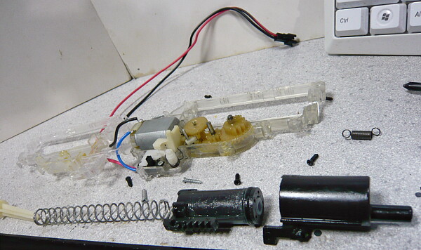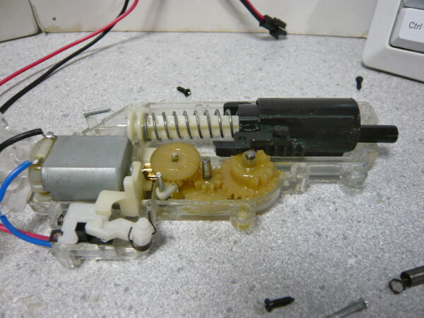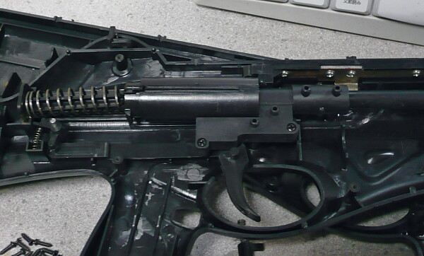 シリンダーに繋がっているメカボックス右側面のスプリングを外し、右側にあるネジを全て外してメカボックスを開けます。トリガースイッチが外れ易いですが、他には飛びやすいところはありません。ノズルはシリンダーに直接付いていてシリンダーごと前後するので普通の電動ガンのメカボックスにあるタペットプレートはありません。それ以外の基本的なパーツ構成と動作は普通の電動ガンと同じ。