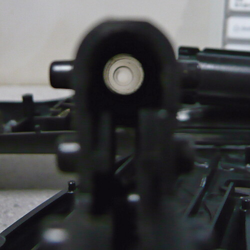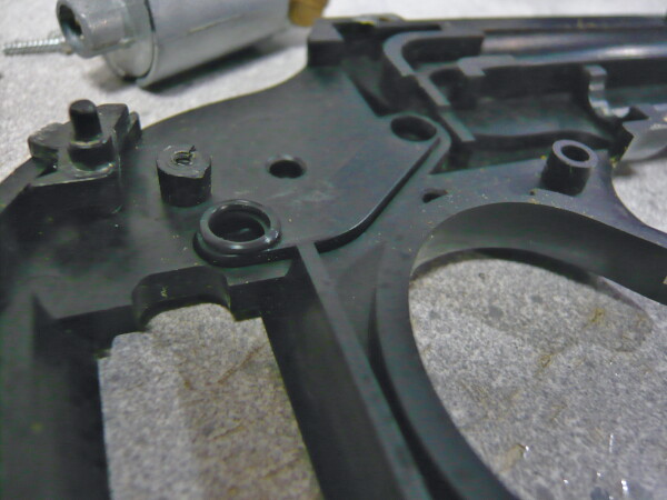 メカボックスのスプリングガイドの後ろ辺りにはヒビが多数見られ、こんなヤワな初速の銃でもかなり負荷が掛かっているようです。スプリング強化が初速アップする上では一番簡単ですが、大抵スプリングの周辺の強度がネをあげるのが常。この間オートマグⅢから取り出したスプリングは長さは許容範囲ですが若干太めでピストン内側にジョリジョリ当たっているので多分抵抗になってちゃんと動作しないと感じたのでやめておきました。もうあと0.5mm外径が細ければ・・・