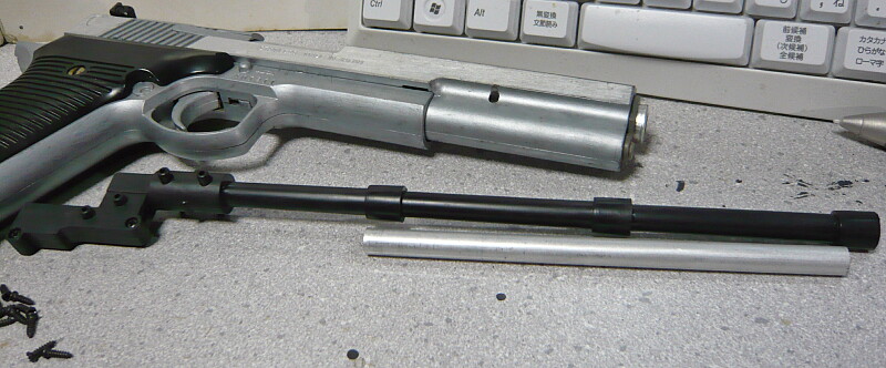 そのまま2本目3本目をオートマグ3のインナーバレルと置き換えると1cmほど足りません。結局芯のズレた2本目を捨てて1本目に3本目を挿し、その次にオートマグ3のインナーバレルを差し込みました。前方にかなり突き出しますがせいぜいガスパイプ前端までなのでアウターの中におさまります。