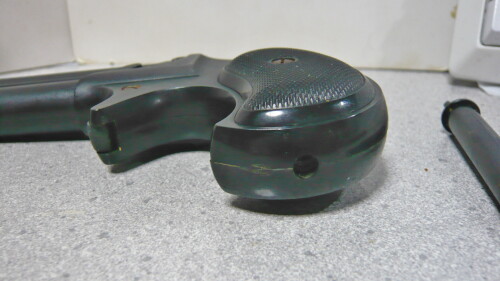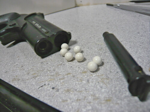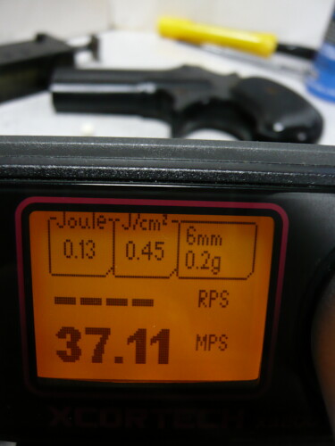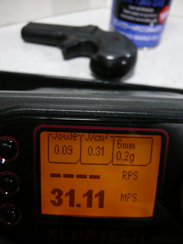 ガスが漏れきらないうちに弾を上側のバレルに流し込み、マガジンの筒を差し込みます。そしてハンマーをコックしてトリガーを引き発射!初速を測ると案外出ています。ブリスター売りのが当時でもこのくらいのパワーだったハズなのでバラしてリフレッシュさせてやれば発売当時の性能を取り戻せるかも?