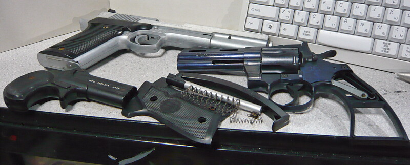 壊れて発射が出来なくなったマルイのエアコキオートマグ3、シリンダーが回らずグリップも無いマルイの作るモデルガンシリーズパイソン4インチ、マルイ電動ブローバックハンドガンM92Fのグリップパネルやスプリング類にマガジンとインナーバレルといった残骸、そして多分マルシンあたりのダブルデリンジャーのガスガン。