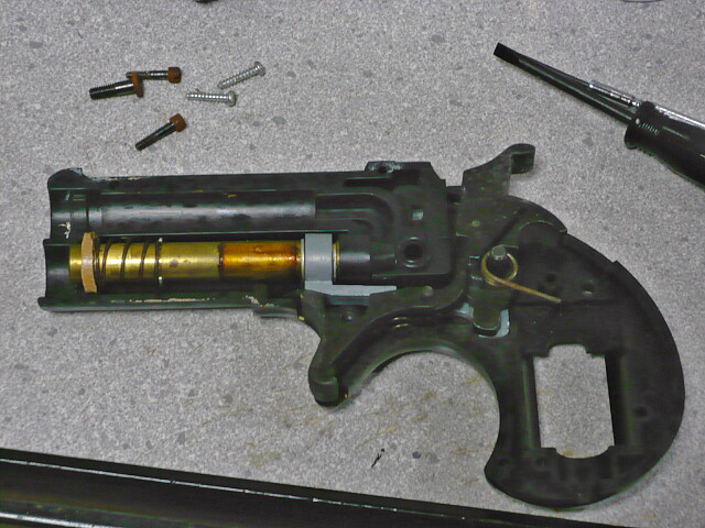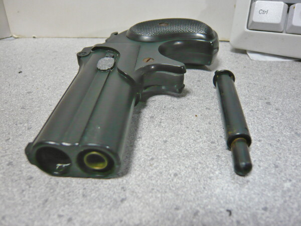 これは確かマルシンが90年代中頃にブリスターパック入りで安く売ってたレミントン・ダブルデリンジャーだと思うのですが確証が持てません。2つある銃身のうち上側がマガジン、下側がバレルになっているガスガンです。上側に刺さっているマガジンは45度回して抜き、筒の中にフォロワーとスプリングが入っていますがロックが無く、どうやってBB弾を詰めたらいいんだろう?