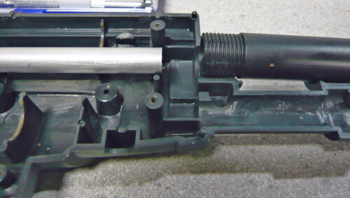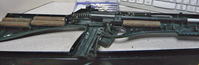 パーツを戻します。ウェイトは入っている本数よりスペースの方が多いので後ろ寄りに並べ変えておきました。この銃には他にマガジンとフォアグリップにも重りが入っているので極端には後ろ寄りにはならない計算。コッキングの際グリップを掴む右手のみの保持になるので前が重いとツライのです。右側にコッキングレバーがある銃なら左手でもっと前の方を持つのでもう少し前寄りでもOKという感じに考えます。