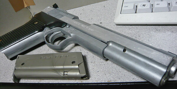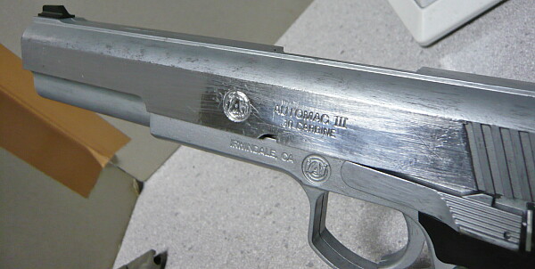 確か基本の塗装はクレオス(当時はグンゼ産業)のMr.カラーの104ガンクローム。今のガンクロームより明るい青み掛かった銀色。実銃オートマグⅢの写真を見ながら近い感じにしたつもりですが、全然再現度が低い・・・もっとこう、粗目のサンドペーパーみたいな表面のつや消しグレーで、スライド側面がポリッシュされヘアラインが入っているのが実銃の姿。あの仕上げは今見てもカッコ良すぎるのでいつかリベンジしたいところです。