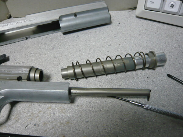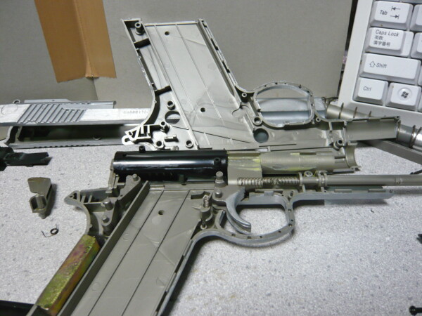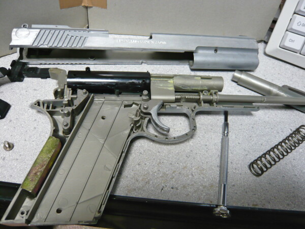部品取りのつもりでバラしていきますが、ちょっと惜しい感じ。分解方法はまずスライド上のリヤサイトにちょっと隠れているネジとスライド前方右にあるネジを抜き、スライド後ろ側を左右に開いてスライドを前方へ抜きます。次にアウターバレルを前方に引っ張って抜いたところが上の写真。そもそもここが簡単に抜けるから発射不能になってしまったのですが、分解する時は楽です。インナーバレルは前回のCX4ストームに使ってしまったのですでに入っていません。