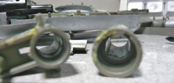 はめ込まれているパーツは外れないので中はまあいいとして、念のために周囲をアロンアルファで埋めて気密しておきます。ブリスター入りの版が出た当時ARMSマガジンに載っていた方法。ここだけは憶えていました。