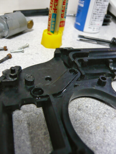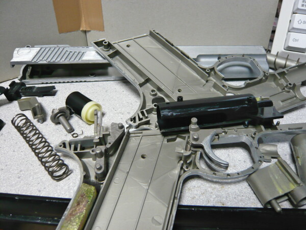 ジャンクパーツとして一緒に出てきた電動ブローバックハンドガンM92Fのメインスプリングを代わりに入れます。テンションが弱く、短かめですが必要な長さは足りています。径も問題無し。M92Fの方は10年ほど前、発売されて間もない頃に買って分解したら元に戻せなくなりその後スライドやフレームは捨ててしまったので一部のパーツしか残っていません。今のはもうちょっとマシだと思うのですが、出たばかりの頃の電ブロM92Fは分解したくなる程残念なブツだったのです・・・
