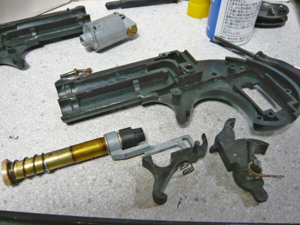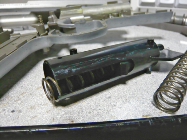 シリンダーからピストンとスプリングを抜き出したところ。この辺りはまだピンシャンとしています。スプリングは18歳以上用なのでテンションが強く、これで確か0.35J前後は出していたかと思います。長いスライド前方を掴んでポンプアクションのように引ける銃なので操作性が非常に良好でした。また買いなおそうかなぁ・・・