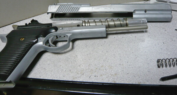 リコイルスプリングはアウターバレルに巻きついているので下のリコイルスプリングガイドにM92Fのリコイルスプリングを挿して組んでみましたが長さが足りずコッキング時にスライドが5mmほど戻りきらずブラブラしていて見苦しいので結局元通りに。