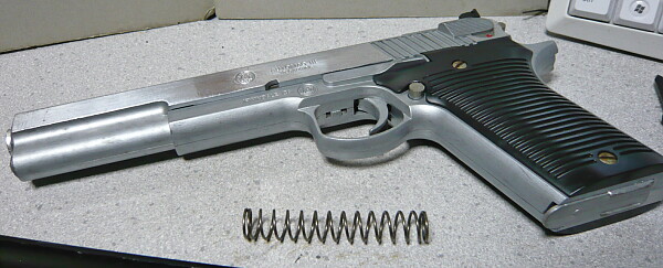 スライドを組み付けネジを締めてリヤサイトをはめ込み完了。ちゃんとコッキングして空撃ちでき、銃口からエアも噴くのですがインナーバレルとチャンバーパッキンが無いので発射は出来ません。でもアクションは失われていないのでモデルガン的に遊ぶ事は出来ます。結局スプリングが置き換わっただけですが、このバネはいつか役に立つかもしれません。