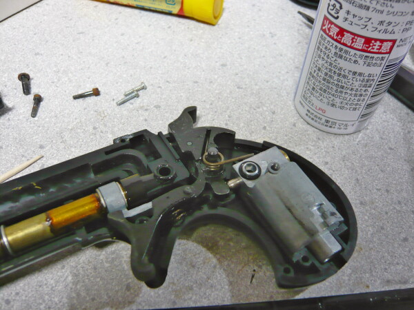 モナカを閉じて噛み合いを確認したらギュッと締めてネジ留め。グリップ内は銀色のプラスネジ、リヤサイトと上下バレル間のネジは小さいマイナスネジ、トリガー左は大きいマイナスネジ。グリップパネルも取り付けてネジで留めます。マガジンのスプリングへも注油し、内部がサビで汚れているのでティッシュを突っ込んで軽く拭きます。
