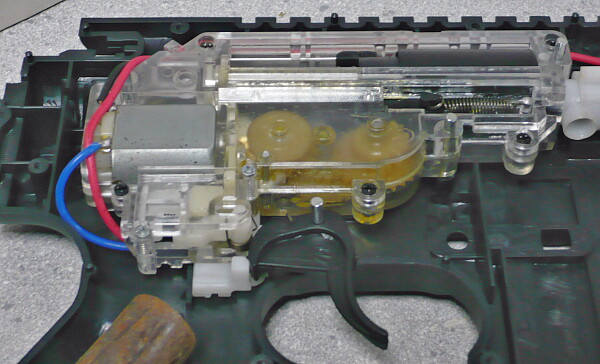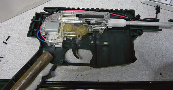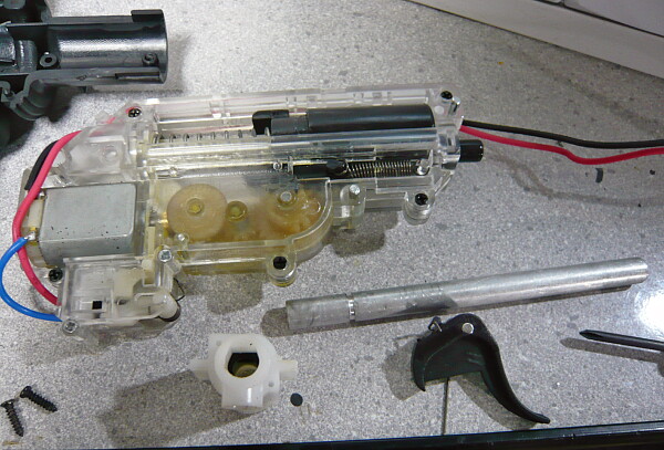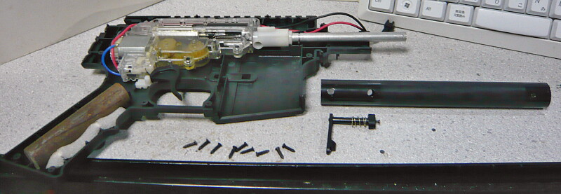 マガジンキャッチをネジを抜いて外し、右側面に見えるネジを全て外してレシーバーの左右モナカを開きます。トリガーのバネを飛ばさないよう注意。中には透明プラ製のメカボックスとジュラコンのような材質のチャンバー、アルミの短いインナーバレル、金属製のアウターバレル、グリップ内の錆鉄棒。