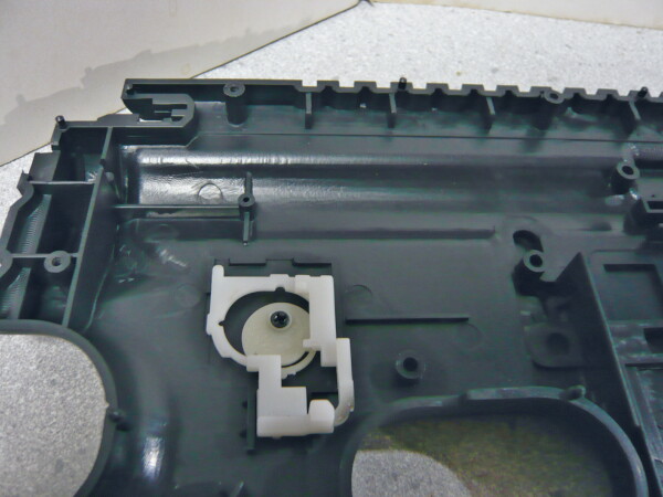 レシーバー内左側にはセレクタースイッチが残ります。ネジでセレクターレバーが裏から留められており、このネジを緩めるとセレクター操作が軽くなりますが、その上に被さるセレクタープレートの円周の内側の溝とセレクター裏の円盤状のパーツの突起がクリック感を生み出していますのでここを削ってクリックの固さも調節できます、が、削りすぎると取り返しが付かなくなるので注意。(削りすぎてSEMI位置のクリックがなくなってしまいました・・・)