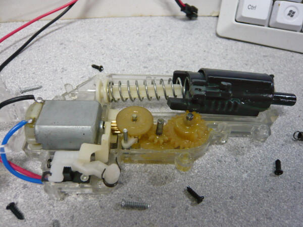 メカボックス内部にはミニ四駆サイズのモーターやプラ製のギヤ類、シリンダーピストンやスイッチが見えます。