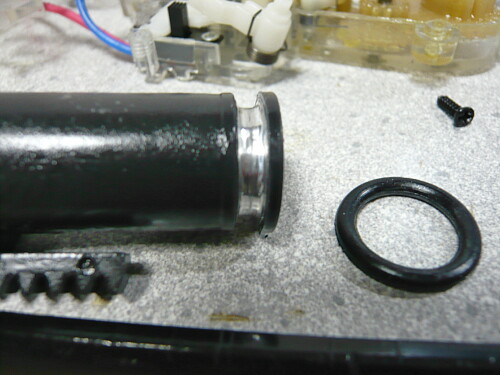 さてこの銃は既に壊れて発射不能になっています。10年ほど前に外で撃っていたところバレルが前方へ射出されてしまい、その時にチャンバーパッキンが抜けて行方不明になっています。そのためマガジンから給弾された弾はインナーバレルの根元に出来上がった空間に留まったままインナーバレルへ入る事もできず発射できないといった状態。ホップアップが無い時代のものなのでチャンバーパッキンは簡単な形状ですが、さんざ使い倒したものなのでこれはもう寿命という事にしてしまいます。今でも普通に手に入る銃だし。