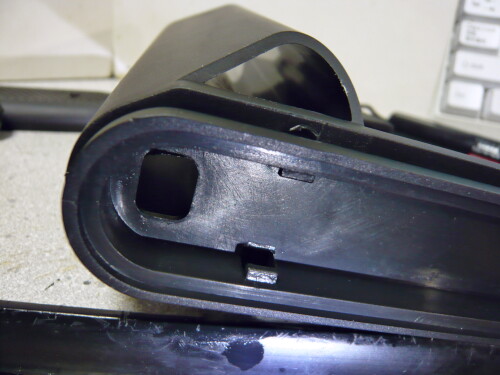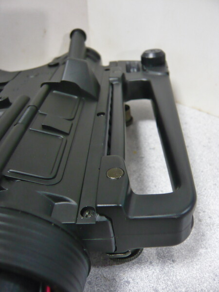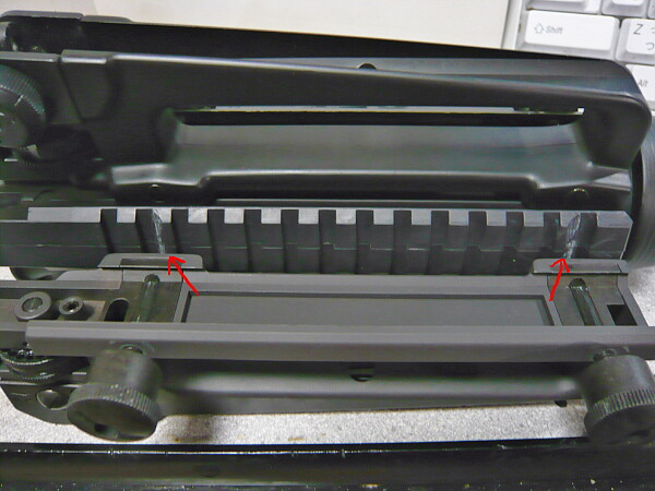この銃のキャリングハンドルは着脱が面倒なのでマルイやトイスターの物と交換してしまいます。そのままでは取り付かないので赤矢印で示した位置のレイルを削ります。それぞれ半分近く削る必要があります・・・