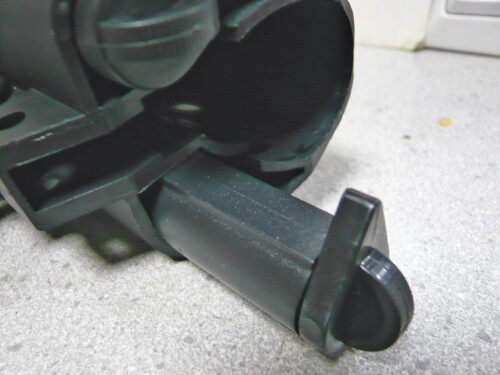 給排気系を取り出しました。スプリングは案外長くてレートも結構あるように感じるのですが、ならば何故初速が20程度しか出ていないのか。スプリングが細いので実際は大したレートが無いが、手で縮めると高レートに感じるだけなのか、ピストンシリンダーの効率が悪くて容積を生かせていないのか。ノズルはシリンダーの中心より下に寄っているし、横には吸気穴も無く、ピストンヘッドは凝った造りながらちゃんと動作しているか怪しい・・・