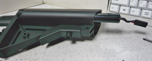 ただ配線をストックチューブに通して完全に内蔵させるには後面の配線の通し方がちょっと難解。この通りバットプレート内にはコネクターを収めても余るくらいスペースがあるのですが、左右のバッテリースペースからは通じているものの穴は配線の太さ分しかありません。ストックチューブへの穴は大きいですが、ストックチューブには穴が開いておらず、簡単でしょうが多少の加工が必要。レシーバー後端のストックチューブ基部の取り付け部分には穴が元々開いています。セパレートバッテリーの左右とメイン配線をそれぞれコネクターでバラにできるように加工したらいけるのでしょうか?そこまでするほどのもんか・・・?