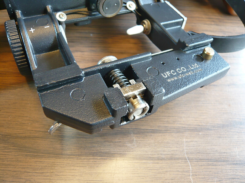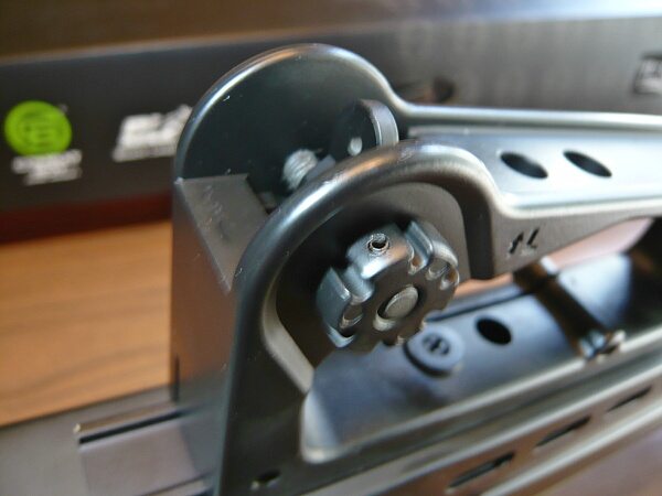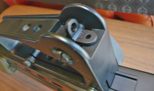 ただしSUSATの下面には丸い突起があり、ここをレイルに3つある穴に合わせる必要があります。この丸い突起は横にあるベロ状の金具で引っ込ませられるので、前後位置を調整する時は取り付けネジを緩めてこのベロ状金具を操作し突起を引っ込ませて前後にスライドさせます。(メンド…無駄な機能…)