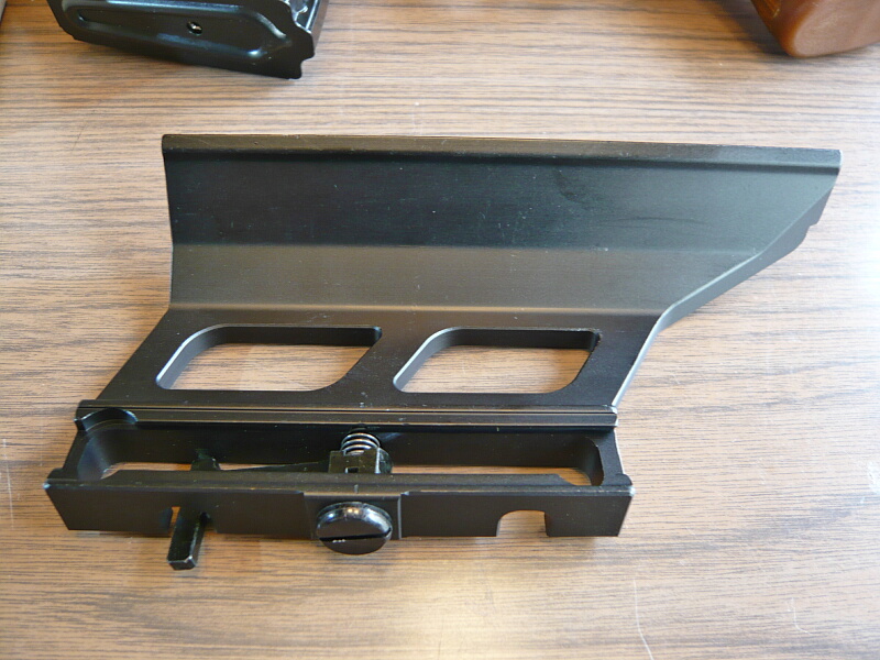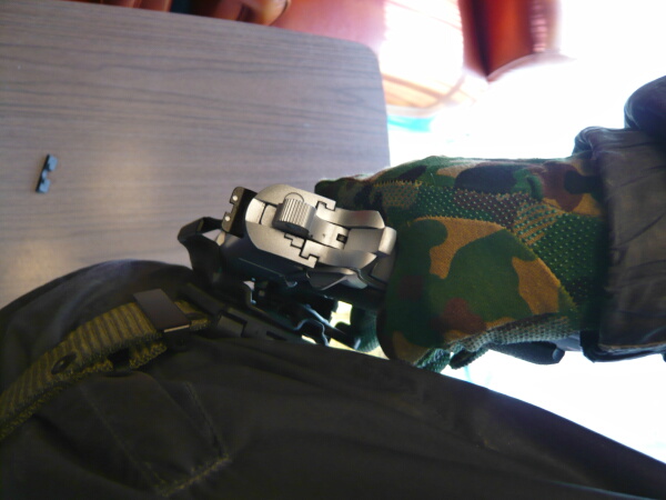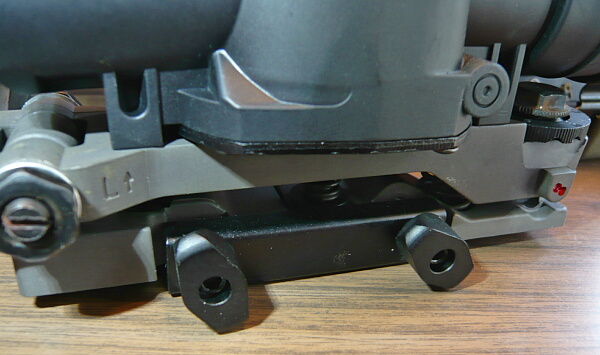 裏側。マウントはQDですが調整ができません。レバーの軸がD断面になっており、平らな面を銃側に向けてレイルに通し、レバーを180度起こして反対側に倒す事でサイドマウントのレールが丸く欠けている部分にレバーの軸の丸い部分を掛けて固定するようになっています。