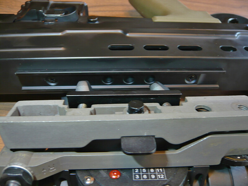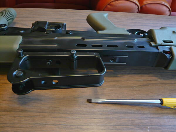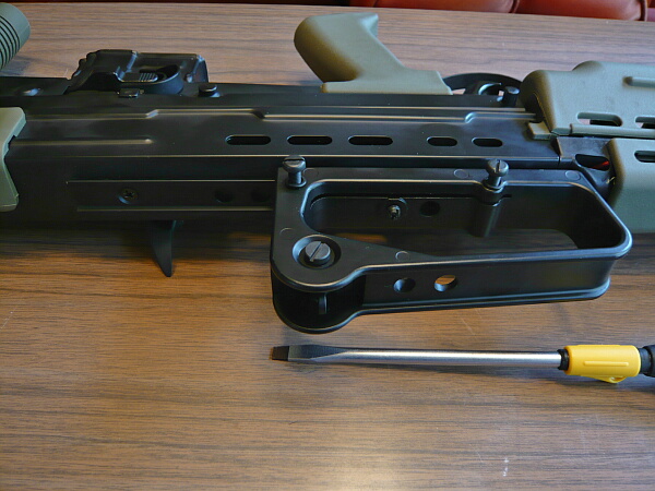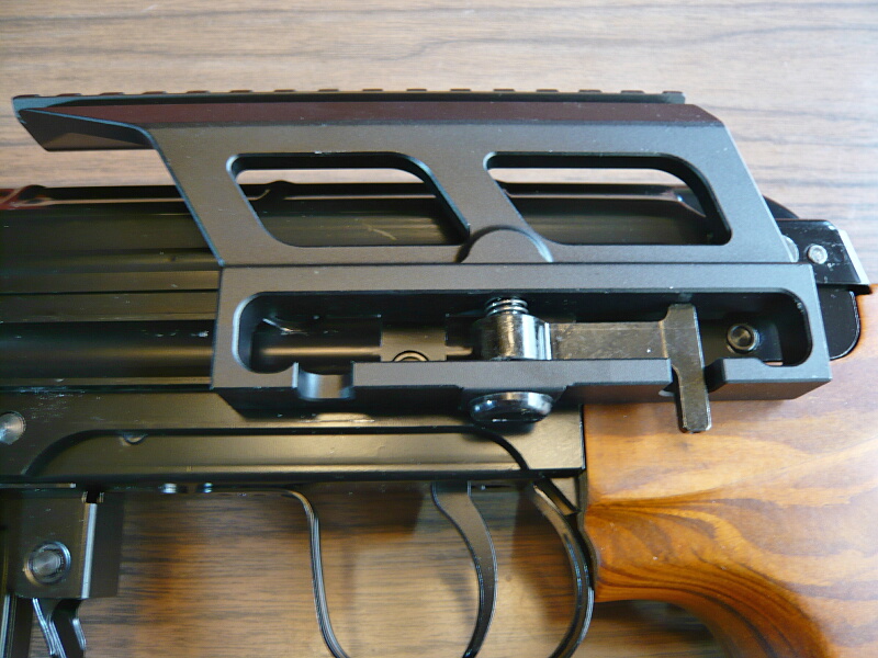 ハンドガード上面を開くのか!これで外れました。キャリハンを外した銃側には専用の幅のレイルがあります。