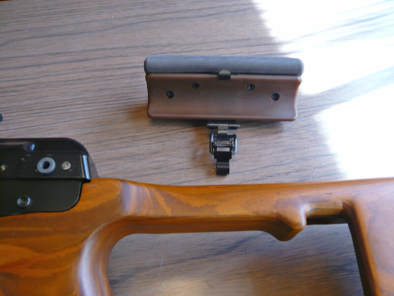 空間を通してアイアンサイトが覗けそう…ちょっと試してみましょうか。アイアンサイトを使う際はチークパッドを外さなければなりません。SVD-Sだと後ろへ引っ張って回せばチークパッドをどかせるのですが、固定ストックのドラグノフはこうです。
