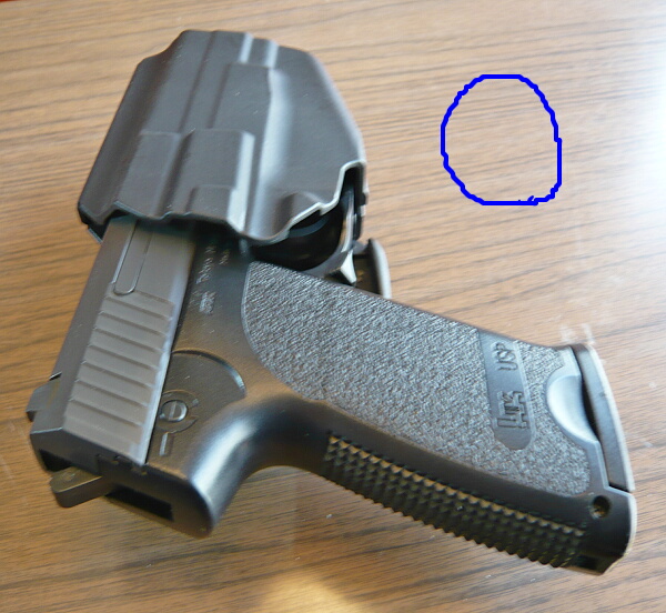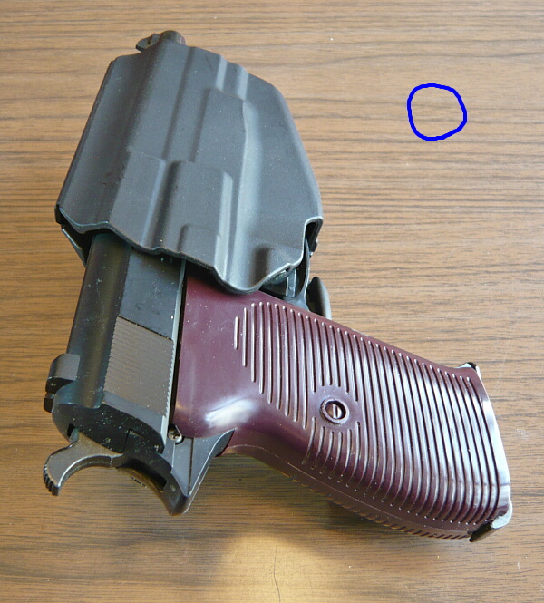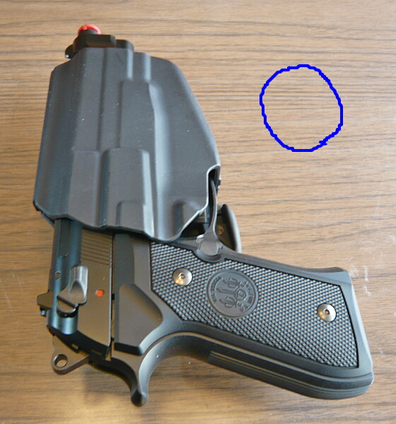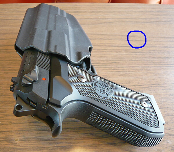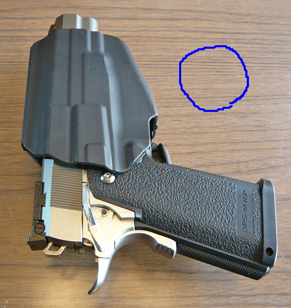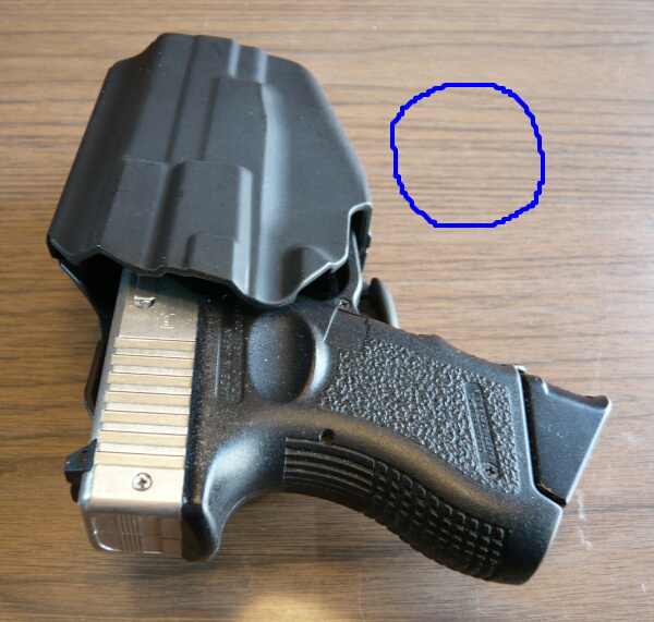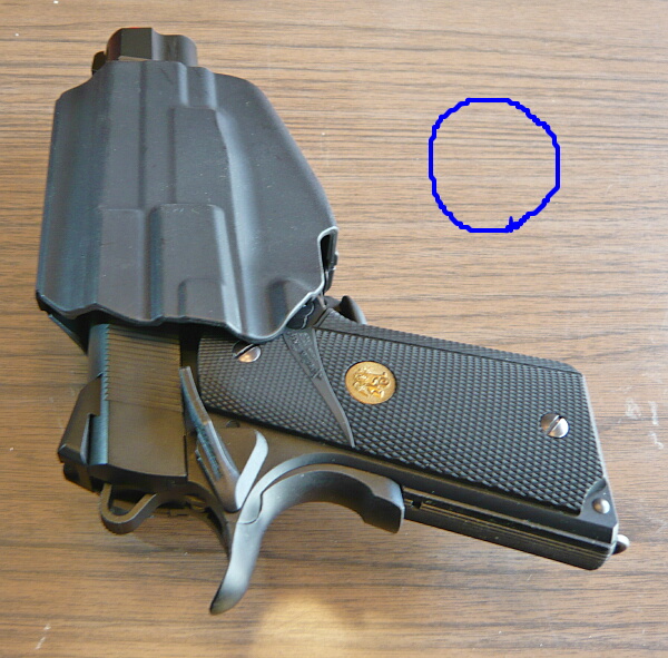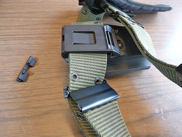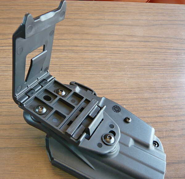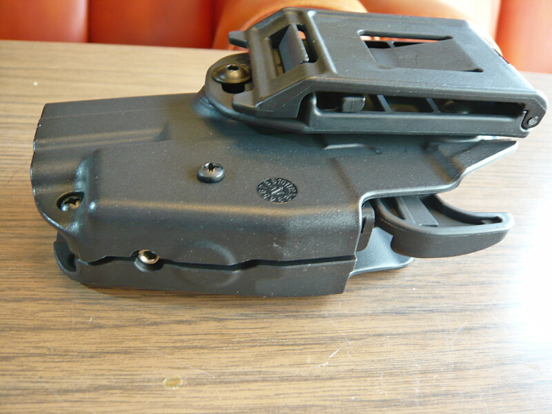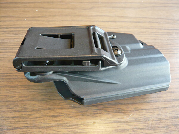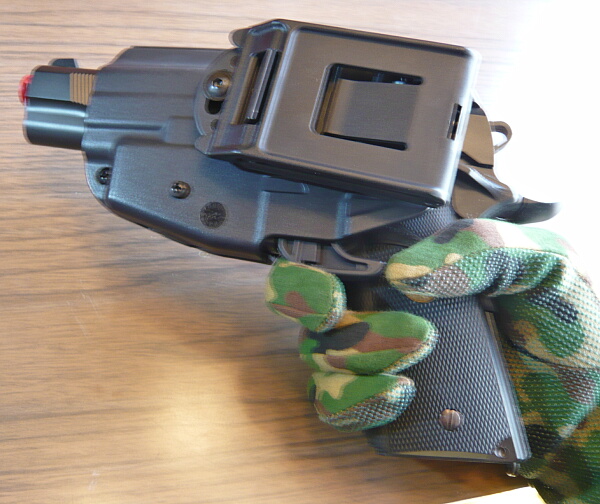 このホルスターはロック機構があり、トリガーガードを引っ掛けてロックしますがCQCホルスターがホルスターの表面に人差し指で操作するレバーがあってこれがうっかりトリガーを触る危険があったのに対し、このホルスターでは後面の位置にレバーがあり中指で操作するようになっています。人差し指でレバーを操作すると銃を抜いたあと構える際に両手で一旦保持して銃を掴み直す必要があるのでややスムーズさに欠きますが、その場合うっかりトリガーに触る事が無いのでより安全だともいえます。