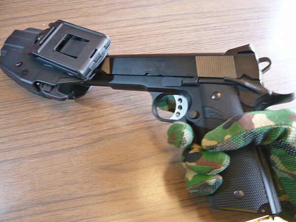 ベルトを腰骨に掛ける感じで、ホルスターは右に。銃はWAのデルタエリート。