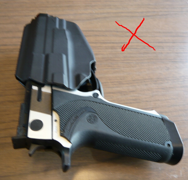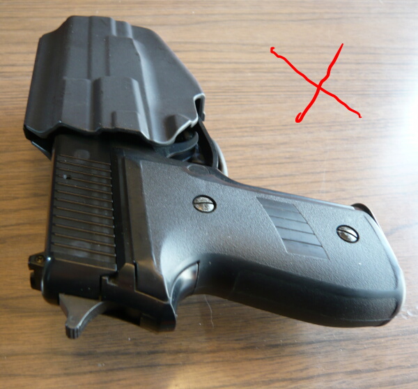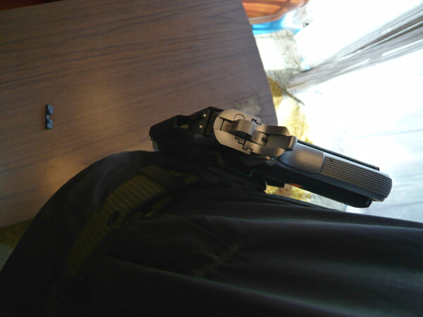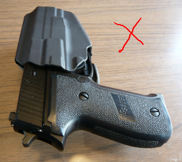 人差し指は伸ばしてトリガー上のフレームに沿わせ(以前よくトリガー下のトリガーガードに沿わせていたのですが、あんまりよくないそうです…)、中指でレバーを操作するので銃を引き抜く時は薬指と小指で主に引き抜く感じになります。少し慣れがいるかも。