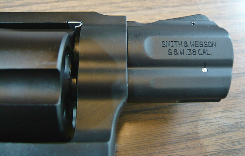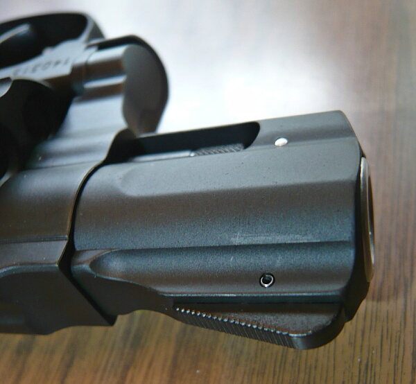 バレル長は2インチ、バレル下にはバレルシュラウドがあります。フロントサイトは後面が斜めに傾斜しておりセレーション(ギザギザ)があって光の反射を抑えてあります。フロントサイトは別パーツになっておりピンで留められています。