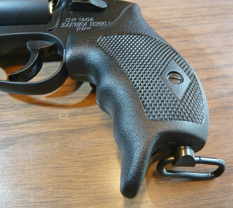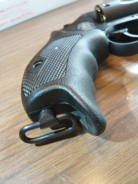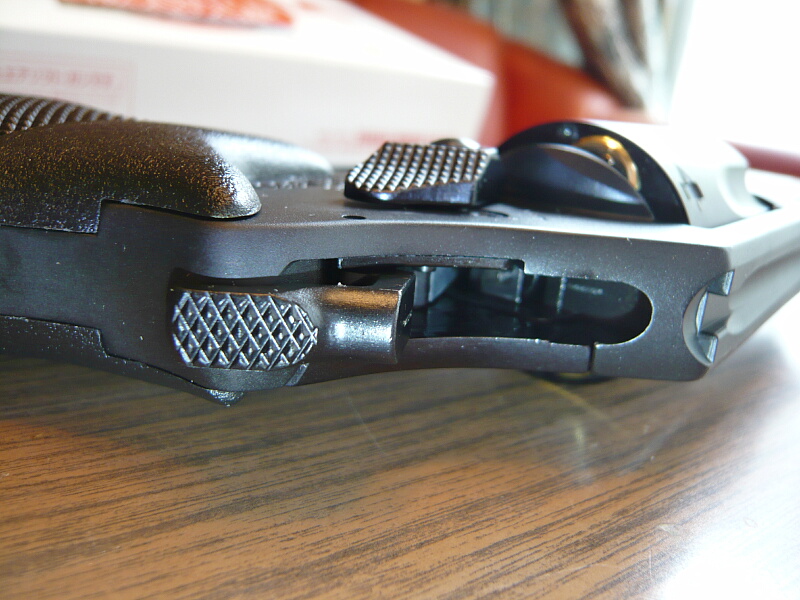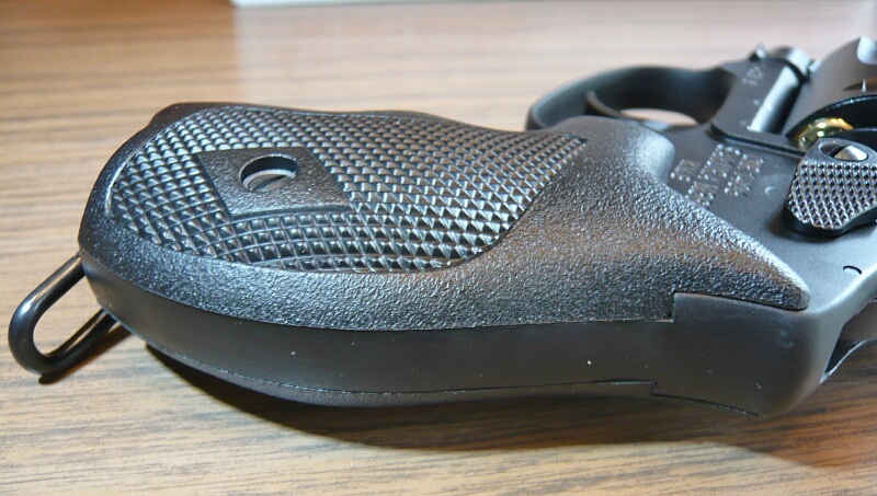 グリップはポリスリボルバーに較べると握り心地はやや細く感じ、特に後面は幅が狭く手のひらへの当たりが強く感じられます。あくまでも比較で。
