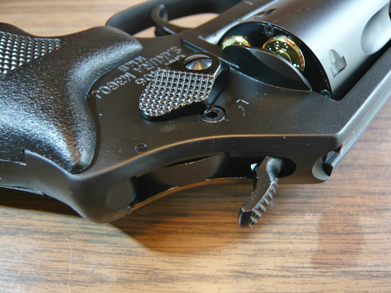ハンマーをコックしたところ。ハンマーは前述のように細く薄く、かなり華奢に感じます。トリガーはシングルアクション位置に来るとトリガーガード内後面との間が1mmも無い位置まで後退し、シングルアクションのトリガープルはストロークをほとんど感じません。軽い力をちょっと加えるとすぐにパチンとハンマーが倒れます。ダブルアクションは常識的に重くなりますがスムーズでスィッと引けます。ただシリンダー軸での回転に少しフリクションがあるのでこなれてくると更にスムーズになるかもしれません。