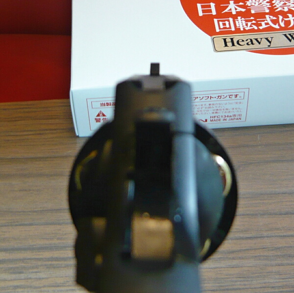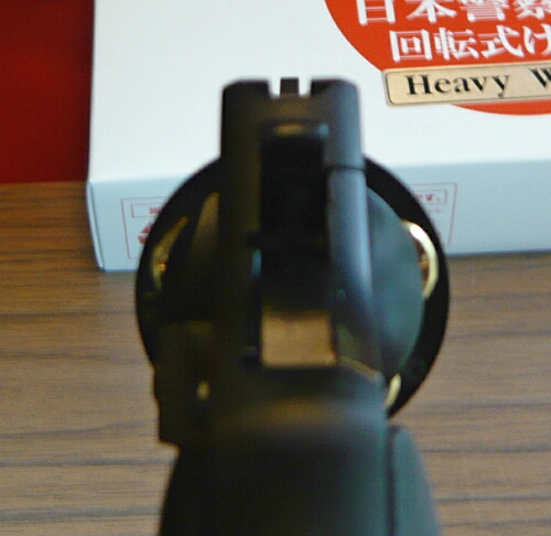 狙点より下に飛ぶのですがHOPは少なくとも10mはフラットに飛んでおりやや弱めなれど効いてはいるので、上写真のようにリヤサイトの上面とフロントサイトの付け根くらいの位置関係だと狙ったところに飛ぶ印象。横から見た写真を見るとわかりやすいかと思うのですが、この銃はリヤサイト上辺と同じ高さのフレーム上面に対してフロントサイトが上に突き出ているのでインナーバレルがマズル部分を上になるように傾けでもしていない限りサイト通りに撃てば下めに着弾するのは当たり前でしょう。でもリボルバーのトイガンはこれくらいの狙点になるものが結構多い気がします(M327もそうだし、マルシンのM686も…)。