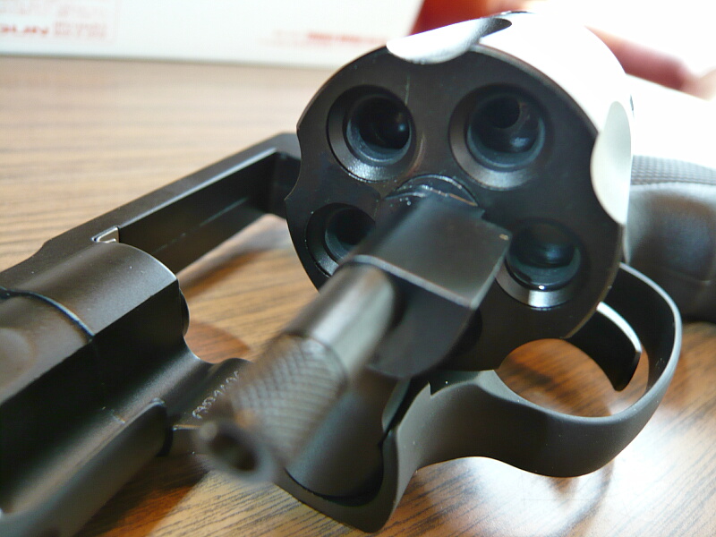 スイングアウトしてヨークがどいた位置にも刻印があります。ヨークの前に出ているエジェクターロッドはシリンダーと連動していないので可動しません。まあここはカート式ではないので…