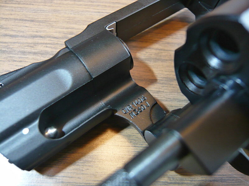 フレーム左面。M360JはM36などS&W Jフレームの系統で.38スペシャルを5発収めるシリンダーを持つ軽量小型タイプ。M360PDではスカンジウム添加アルミニウム合金を使用するフレームにチタンのシリンダーをもち軽量化されていますが、日本の警察で採用されたM360Jではチタンではなくステンレスのシリンダーとしています。このトイガンではフレームはHW樹脂、シリンダーはアルミでしょうか。