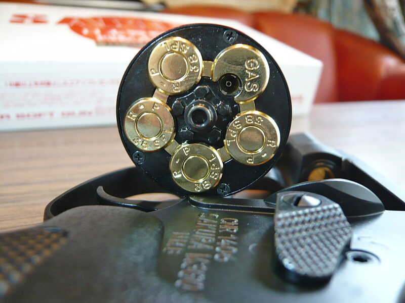 シリンダーを回転させると前面の穴にカチカチと装填されます。(弾倉内が汚れてるのか出てくるBB弾が汚い…)