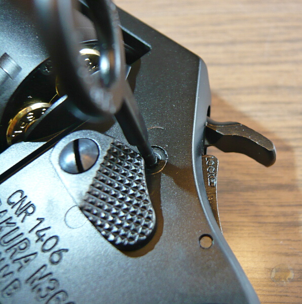 サムピースの脇にある六角穴はロック機構。付属のキーを差し込み刻印の通りに回すとハンマーの左横に「LOCKED」と書かれたプレートがせり上がります。この状態ではハンマーがロックされます。発射前に解除するセーフティではなく、保管時に誰かが勝手に触って撃発しないようにするためのものと思ったら良いでしょう。