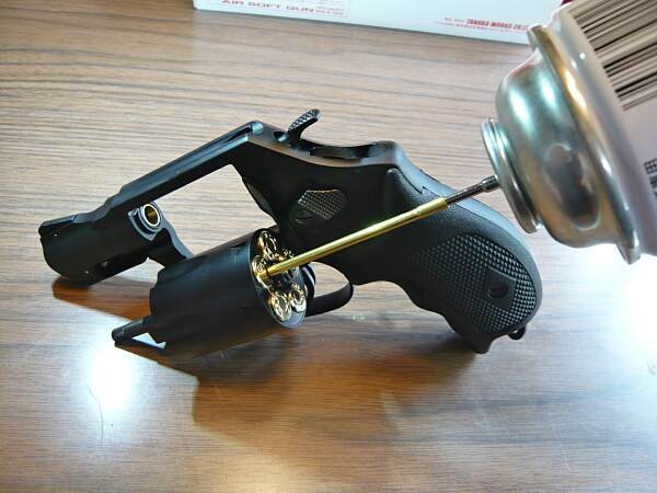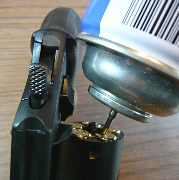 それではいよいよ発射の準備を。まずはガスを注入するのですが、M327ではシリンダーが大きいのでアダプター無しでも何とか入ったものの、こちらは小さいので無理。