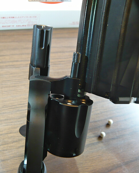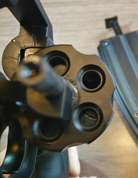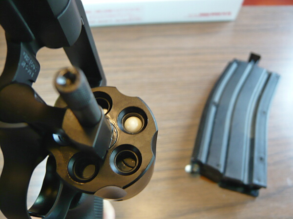 次にBB弾を装填します。シリンダーをスイングアウトさせ、前から見て2時の位置の穴が弾倉になっているのでここへBB弾を詰め込みます。