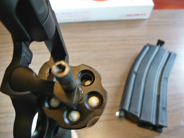 穴5か所に装填されたら2時の位置の穴に更に弾を押し込みます。これで更に4発入るので合計10発が装填されます。