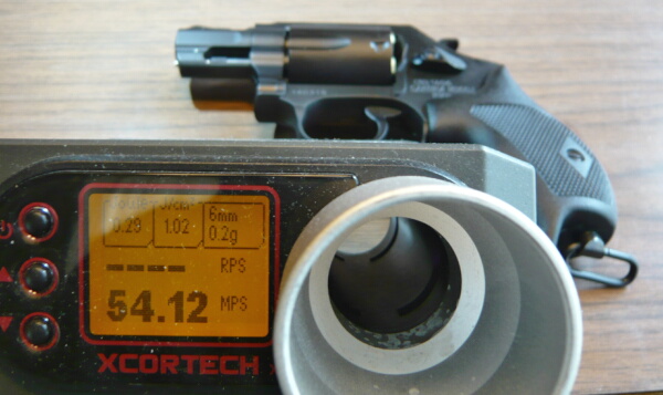 0.2gで52~54m/sほど。ダブルアクションでもシングルアクションでも初速はほぼ同じ。