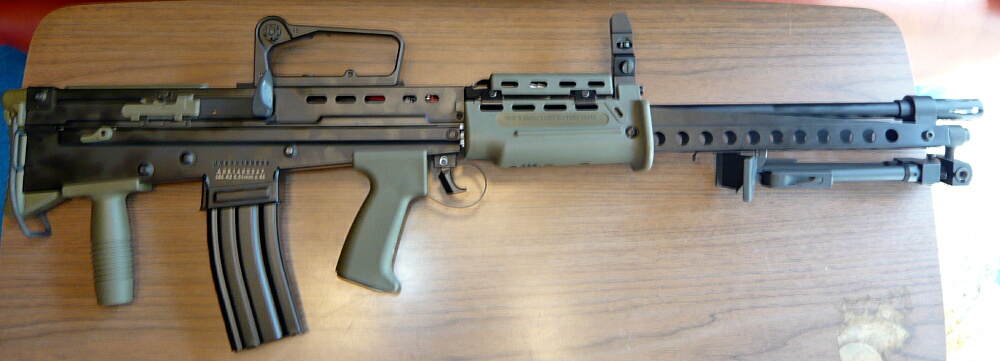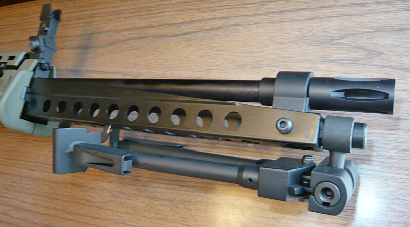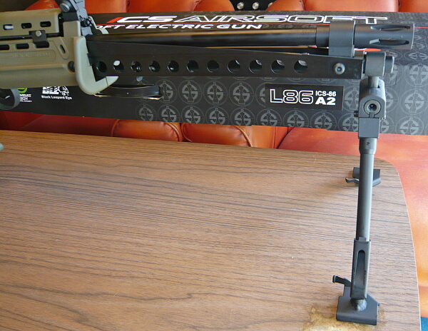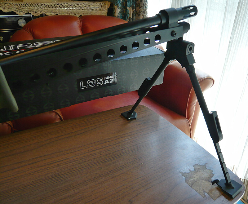 L86の特徴的なバレル周り。バレル下に構造物を介して先端にバイポッドが装着されています。