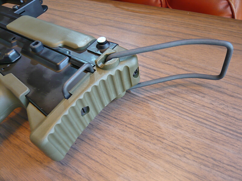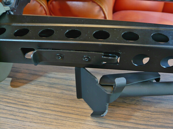 バイポッドは脚2本を束ねてバレル下の構造物の下にはめ込まれて畳まれますが、構造物側に前後にスライドするパーツで固定されるようになっています。ただしやや操作性が悪くて、両手を使わないとバイポッドの格納/展開を行えません。