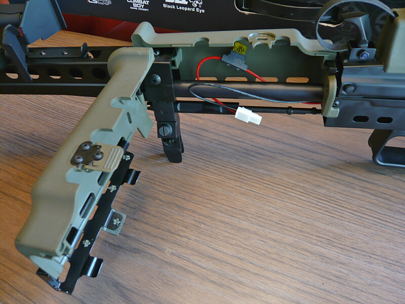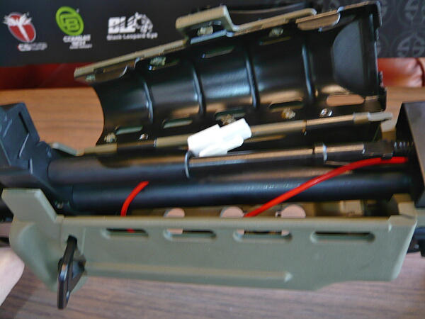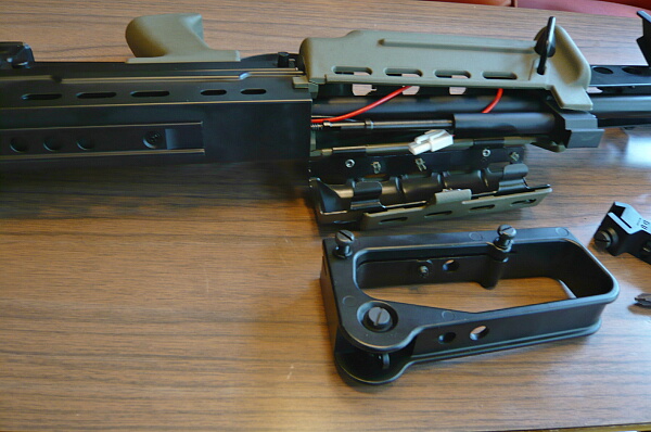 上写真では銃が逆さになっていますが、ハンドガード上を開いた状態でハンドガード下面のスイッチを開くとハンドガード右半分が前ヒンジで開きます。バッテリースペースへはこうしてアクセスします。