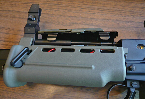 ハンドガード上部は右側にヒンジがあり、左側から上に開きます。
