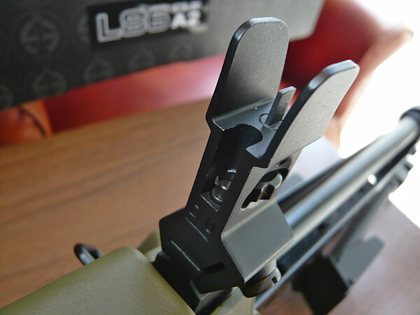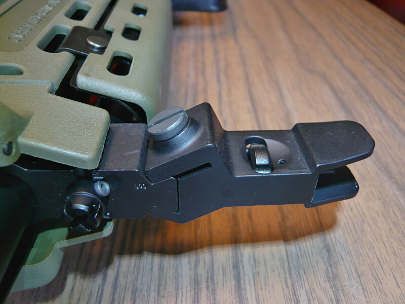 リヤサイトはピープタイプで、M16/M4のキャリハンのリヤサイト同様にピープの大小を切り替えられるようになっています。