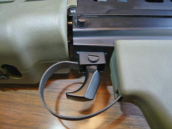 板バネのようなトリガーガード内には特徴的な形状のトリガーがあります。トリガーのストロークはやや長めで、ストロークの中間付近に「カチン」とした手応えがあります。トリガープルは少し重め。
