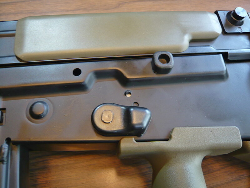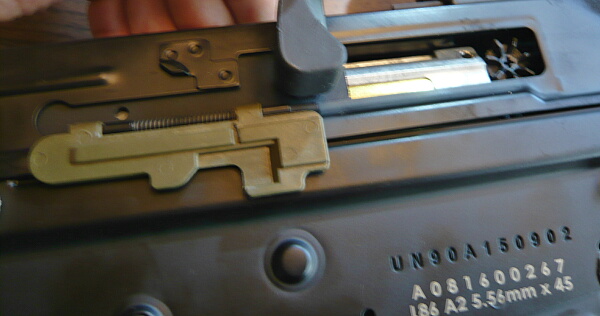 レシーバー左側に戻ってセレクター。ここではセミオートとフルオートの切り替えのみ行われます。上画像のようにセレクターが上になっているとセミオート。