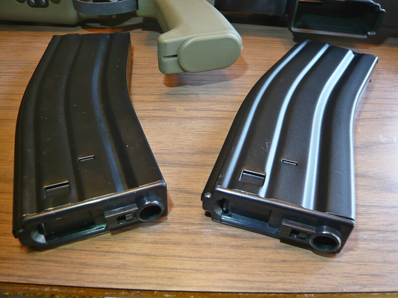 スタンダード電動M4系互換なので他社のものも使えそうです。とりあえず手近にあったマグプルP-MAGを。近年では実銃もマグプルE-MAG(ツルリとした外観で残弾確認用の小窓の付いたタイプ)が使われているとか。